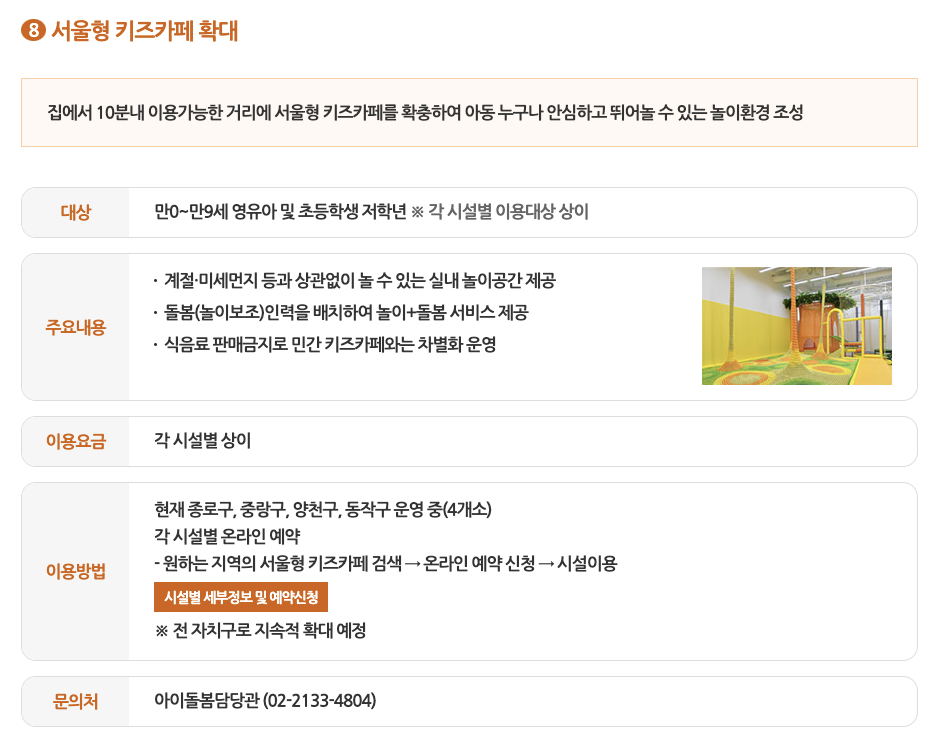 집에서 10분 거리 내에서 이용가능한 서울형 키즈카페를 확충하여 아이들에게 안전한 놀이환경을 조성할 예정입니다. , 현재는 종로, 중랑, 양천, 동작 총 4곳에서 운영 중이지만, 추후 전 지역으로 확대 예정입니다.