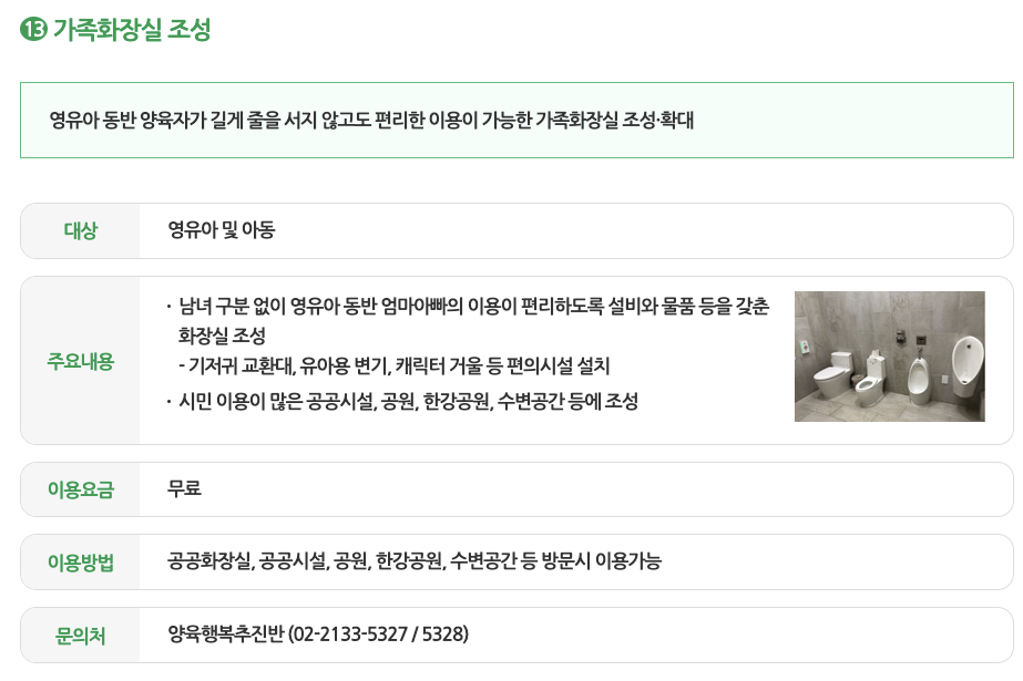 영유아 동반 양육자가 화장실 이용을 위하여 오랜 시간 기다리지 않도록 남녀 구분 없이 이용할 수 있는 가족화장실 조성 및 확대할 예정입니다.