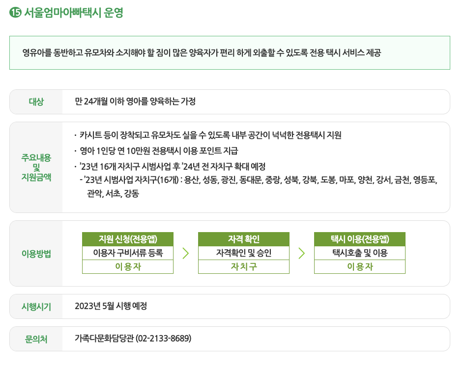 영유아를 동반하여 많은 짐을 가지고 이동해야 하는 양육자와 아이를 위하여 편하게 이용할 수 있는 전용 택시를 제공하는 서비스입니다.